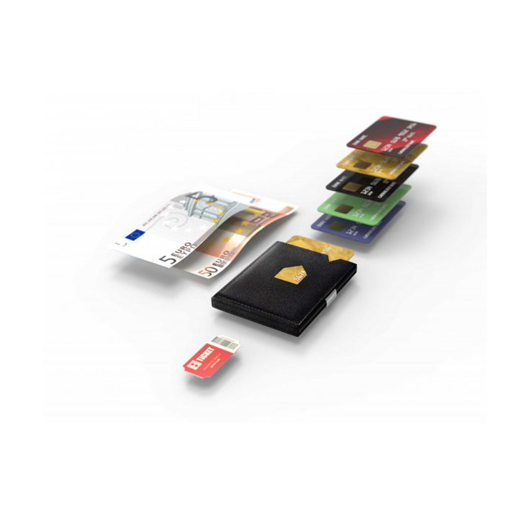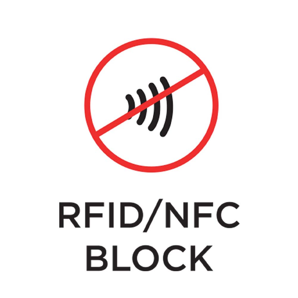 Περιέχει προστασία RFID για να διασφαλίσει ότι οι προσωπικές σας πληροφορίες και οι πιστωτικές σας κάρτες είναι ασφαλείς. Από τις έξι θήκες, οι δύο μπορούν να λειτουργήσουν ανέπαφα. Όταν το πορτοφόλι είναι κλειστό καμία κάρτα δεν λειτουργεί ανέπαφα.